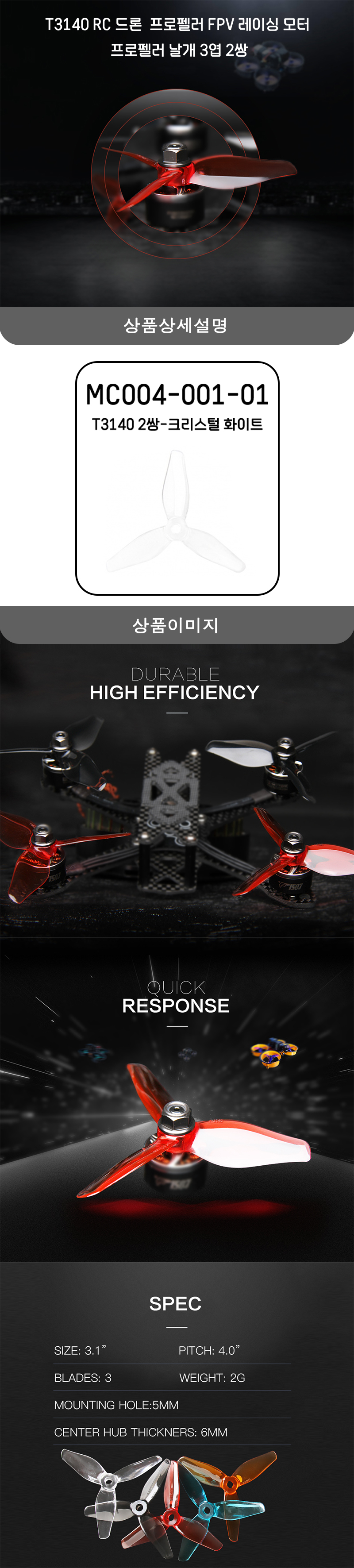 상품코드 및 모델명 :T3140 RC 드론  프로펠러 FPV 레이싱 모터 프로펠러 날개 3엽 2쌍 화이트