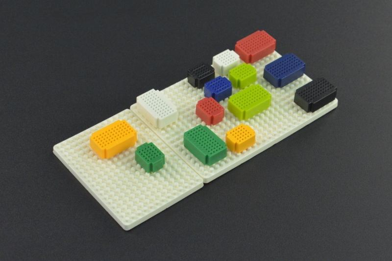 This kit includes two kinds of mini multi-color block building breadboards and 2 base plates of different sizes. Users can freely assemble these breadboards to make various projects combining with other microcontrollers like ArduinoRaspberry Pi, etc., or use them in circuit assembly and test in experiments or robotic applications.