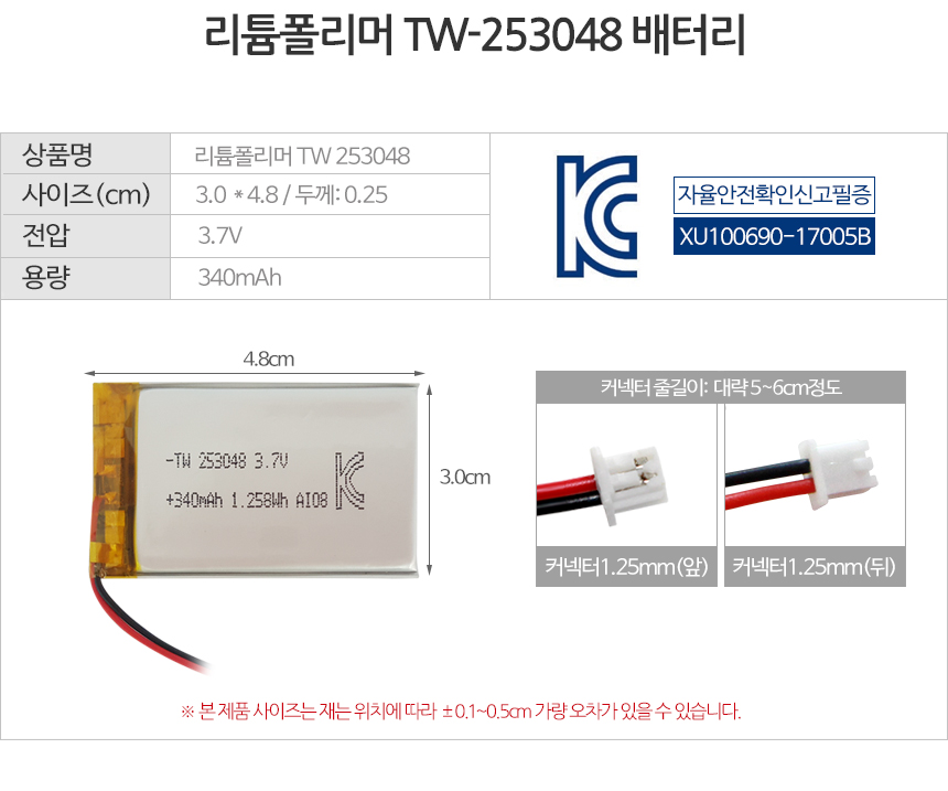 • 리튬폴리머배터리 TW253048-340mAh/KC인증/3.7V