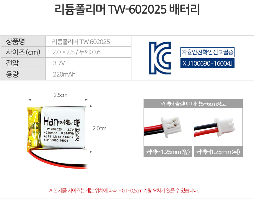 리튬 폴리머 배터리 TW602025-220mAh/KC인증/3.7v